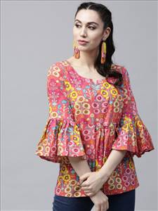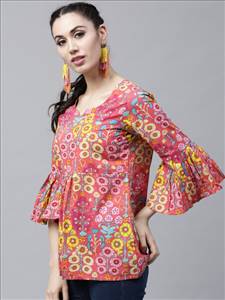 Pink printed tunic, has a round neck, three-quarter sleeves, gathers detail