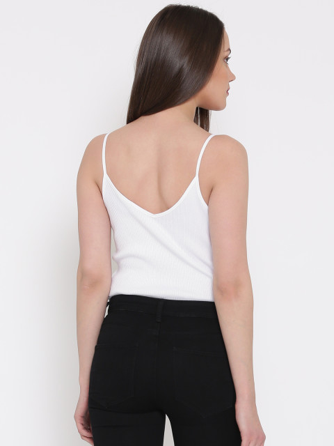 White knitted bodysuit, has shoulder straps forming a round neck, short zip closure and press-button closures on the crotch